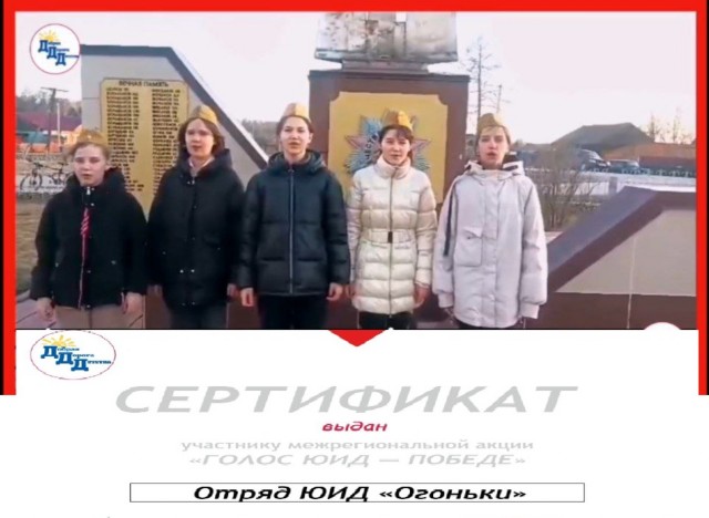 Отряд ЮИД «Огоньки» принял активное участие в межрегиональной акции «Голос ЮИД -ПОЕДЕ». Ребята отмечены сертификатом Регионального отделения ООДЮЮ ЮИД в Кемеровской области — Кузбасе за исполнение песни «Катюша»