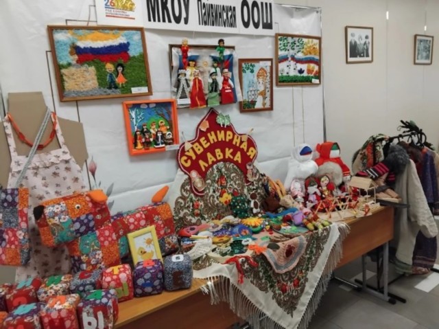 Все поделки были выставлены в сувенирной лавке, украшенной на стенде картинами сделанными в разных техниках. Это и квиллинг-ребятами 7 класса, и рисование нитками- девочками Лидер Элиной и Черновой Викторией, и воздушным пластелином- ребятами начальных классов, и рисунок русской красавицы- Лидер Элины, и работа смешанной техникой, там и лепка из глины и ткань- ученицы 9 класса. Все товары в сувенирной лавке тоже сделаны разными техниками. Тут было и шитье-кухонный фартук- Лидер Элина, и лоскутное шитье- работы ребят 7 класса, и рисование на спилах- Федорова Анастасия и Ушакова Диана, и выжигание-Бураков Владислав, и роспись на ложках- Чернова Виктория, и поделки из палочек-Столбин Владимир, и валяние из шерти- Чернова Виктория и Лидер Элина, и поделки из фетра- ребята 5-6 классов, и украшения из бусин и бисера, а также вылитые из эпоксидной смолы- Лидер Элиной и Черновой Викторией, и вязание крючком- Шабалиной Еленой. А также на выставке были показаны костюмы народов ханты, которые сшили и украсили старшие девочки школы вместе с учителем Калугиной Ириной Александровной для выступления театра. Мы все очень довольны результатом нашей совместной работы.